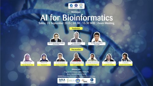 Webinar nasional bertajuk AI for Bioinformatics telah terselenggara dengan lancar pada tanggal 20 September 2025 secara daring melalui platform Zoom Meeting. Kegiatan ini menjadi momentum penting dalam mendorong integrasi antara kecerdasan buatan (artificial intelligence/AI) dan bioinformatika di Indonesia. Lebih dari 300 peserta dari berbagai institusi di seluruh Indonesia telah berpartisipasi aktif dalam diskusi yang berlangsung sejak pagi hingga sore hari. Tema yang diangkat tidak hanya mencerminkan kebutuhan mendesak dalam menghadapi tantangan analisis data biologi molekuler, tetapi juga membuka ruang diskusi untuk membangun sinergi yang lebih erat antara komunitas ilmu komputer dan biologi.